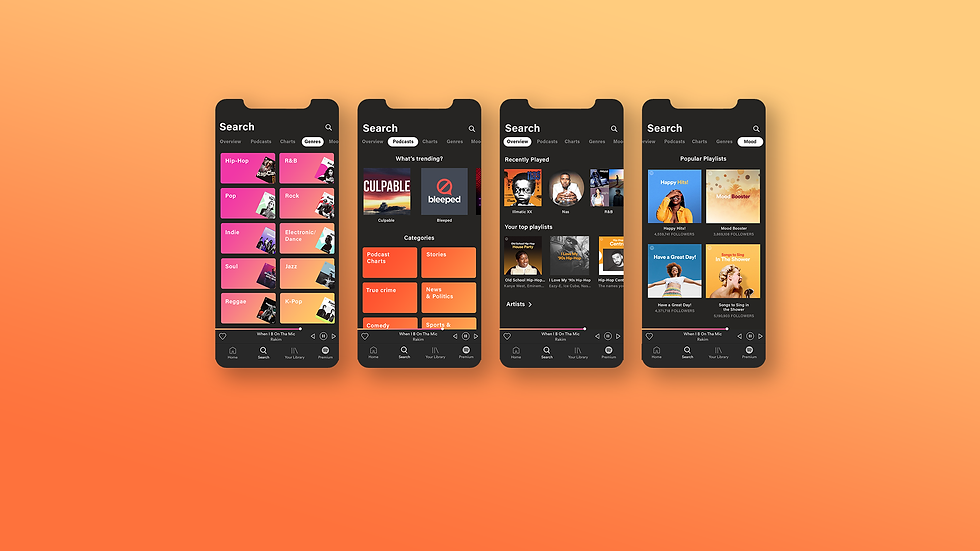 Create separate tabs so that it’s easier for users to find what they’re looking for. (Overview, Podcasts, Charts, Genres, Moods, New Releases & Discover)
